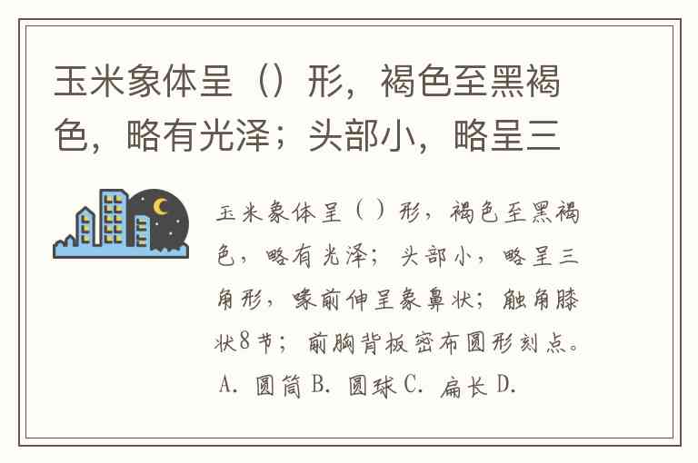 玉米象体呈()形,褐色至黑褐色,略有光泽;头部小,略呈三角形,喙前伸呈象鼻状;触角膝状8节;前胸背板密布圆形刻点。 A. 圆筒 B. 圆球 C. 扁长 D. 扁方