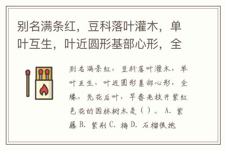别名满条红,豆科落叶灌木,单叶互生,叶近圆形基部心形,全缘,先花后叶,早春老枝开紫红色花的园林树木是()。 A. 紫藤 B. 紫荆 C. 梅 D. 石榴