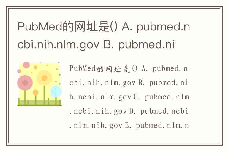 PubMed的网址是() A. pubmed.ncbi.nih.nlm.gov B. pubmed.nih.ncbi.nlm.gov C. pubmed.nlm.ncbi.nih.gov D. pubmed.ncbi.nlm.nih.gov E. pubmed.nlm.nih.ncbi.gov