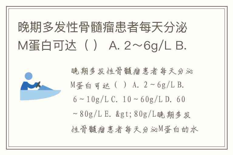 晚期多发性骨髓瘤患者每天分泌M蛋白可达( ) A. 2~6g/L B. 6~10g/L C. 10~60g/L D. 60~80g/L E. >80g/L