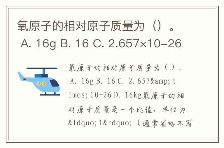 氧原子的相对原子质量为()。 A. 16g B. 16 C. 2.657×10-26 D. 16kg