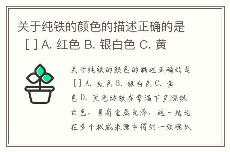 关于纯铁的颜色的描述正确的是 [ ] A. 红色 B. 银白色 C. 黄色 D. 黑色