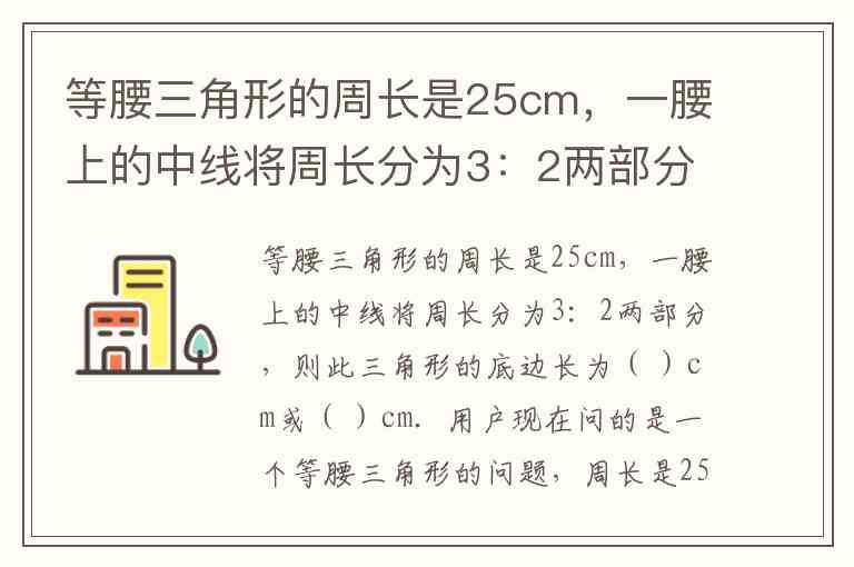 用户现在问的是一个等腰三角形的问题,周长是25cm,一腰上的中线将周长分为3:2两部分,求底边长。首先,我需要回忆一下等腰三角形的性质,两腰相等,中线是连接顶点和对边中点的线段,所以一腰上的中线会把这条腰分成两段相等的部分,也就是每段是腰长的一半。