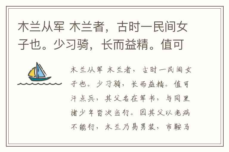 木兰从军 木兰者,古时一民间女子也。少习骑,长而益精。值可汗点兵,其父名在军书,与同里诸少年皆次当行。因其父以老病不能行,木兰乃易男装,市鞍马,代父从军,溯黄河,度黑山。转战驱驰凡十有二年,数建奇功。嘻!男子可为之事女子未必不可为,余观夫木兰从军之事因益信。 下列加点字解释不正确的一项是( ) A. 长而益精(更加) B. 因其父以老病不能行(因为) C. 市鞍马(买)