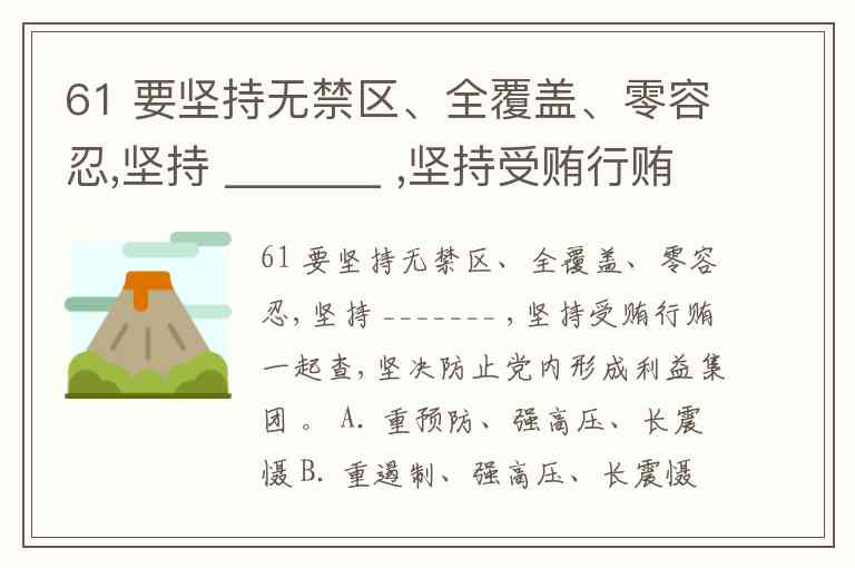 61 要坚持无禁区、全覆盖、零容忍,坚持 _______ ,坚持受贿行贿一起查,坚决防止党内形成利益集团 。 A. 重预防、强高压、长震慑 B. 重遏制、强高压、长震慑 C. 重遏制、不减压、长震慑 D. 重遏制、强高压、长威慑