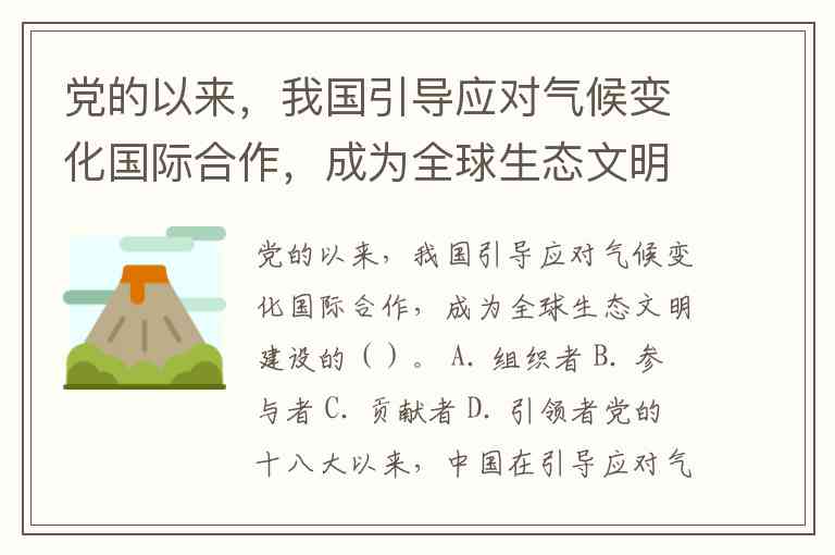 党的以来,我国引导应对气候变化国际合作,成为全球生态文明建设的()。 A. 组织者 B. 参与者 C. 贡献者 D. 引领者