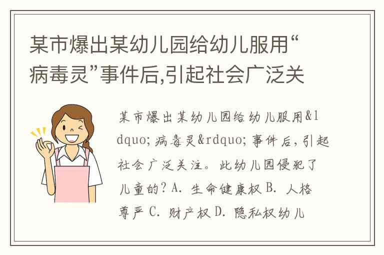 某市爆出某幼儿园给幼儿服用“病毒灵”事件后,引起社会广泛关注。此幼儿园侵犯了儿童的? A. 生命健康权 B. 人格尊严 C. 财产权 D. 隐私权