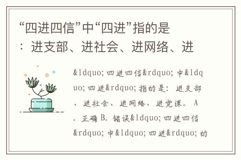 “四进四信”中“四进”指的是:进支部、进社会、进网络、进党课。 A. 正确 B. 错误