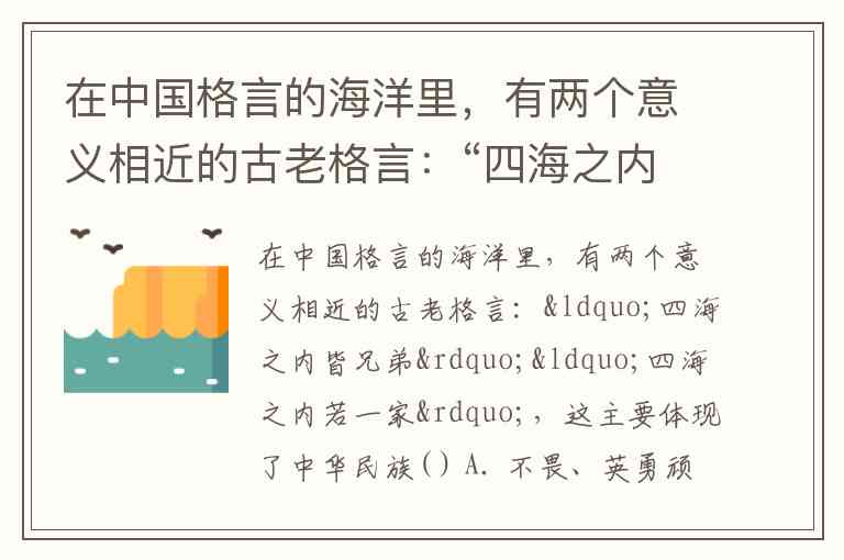 在中国格言的海洋里,有两个意义相近的古老格言:“四海之内皆兄弟”“四海之内若一家”,这主要体现了中华民族( ) A. 不畏、英勇顽强的优良品格 B. 以“礼仪之邦”享誉于史 C. 开拓进取、自强不息的民族意识 D. 注重团结、呼唤统一的民族精神