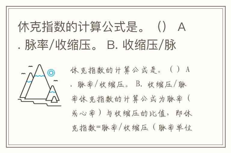 休克指数的计算公式是。() A. 脉率/收缩压。 B. 收缩压/脉率