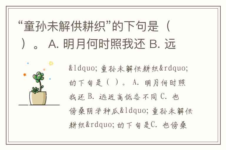 “童孙未解供耕织”的下句是( )。 A. 明月何时照我还 B. 远近高低各不同 C. 也傍桑阴学种瓜