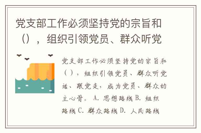 党支部工作必须坚持党的宗旨和(),组织引领党员、群众听党话、跟党走,成为党员、群众的主心骨。 A. 思想路线 B. 组织路线 C. 群众路线 D. 人民路线