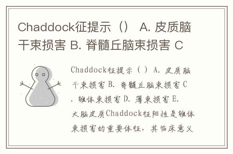 Chaddock征提示() A. 皮质脑干束损害 B. 脊髓丘脑束损害 C. 锥体束损害 D. 薄束损害 E. 大脑皮质