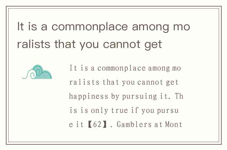 It is a commonplace among moralists that you cannot get happiness by pursuing it. This is only true if you pursue it【62】. Gamblers at Monte Carlo are pursuing money, and most of them lose it instead,【63】there are other ways of pursuing money, which often succeed.【】it is with happiness. If you pursue it by【65】of drink, you are forgetting the hang-over (宿醉). Greek philosopher Epicurus pursued it by living only in congenial (趣味相投的) society and eating only dry bread, supplemented by a little cheese on feast days. His method【66】successful in his case, but he was a sick and weak man, and most people would need something more【67】. For most people, the pursuit of happiness,【68】supplemented in various ways, is too abstract and theoretical to be adequate as a personal rule of life. But I think that whatever personal rule of life you may choose it should, except in rare and heroic cases, be compatible【69】happiness. There are a great many people who have all the【70】conditions of happiness, i.e. health and a sufficient income, and who,【71】, are profoundly unhappy. In such cases it would seem as if the【72】must lie with a wrong theory as to how to live. In one【73】, we may say that any theory as to how to live is wrong. We imagine ourselves more different from the animals than we are. Animals live on【74】, and are happy as long as external conditions are【75】. If you have a cat it will enjoy life if it has food and warmth and opportunities for an【76】night on the tiles. Your needs are more complex than those of your cat, but they still have their basis in instinct. In civilized societies,【77】in English-speaking societies, this is too【78】to be forgotten. People propose to themselves some one paramount (最 高的) objective, and【79】all impulses that do not minister to it. A businessman may be so anxious to grow rich that to this end he sacrifices health and private【80】. When at last he has become rich, no pleasure remains to him except harrying (折 磨) other people by exhortations (训词) to【81】his noble example. (63) A. eagerly B. reasonably C. reluctantly D. unwisely