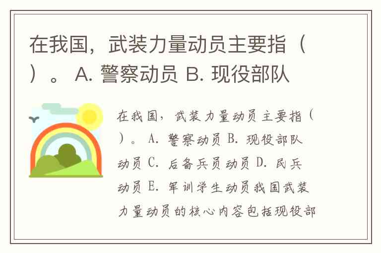 需要注意的是,警察动员(A选项) 通常属于社会安全动员范畴,而非武装力量动员;军训学生动员(E选项) 未被列入法定动员体系。这一区分体现了我国国防动员“专群结合、平战一体”的特点——既依靠专业化武装力量,也发挥后备力量的补充作用。