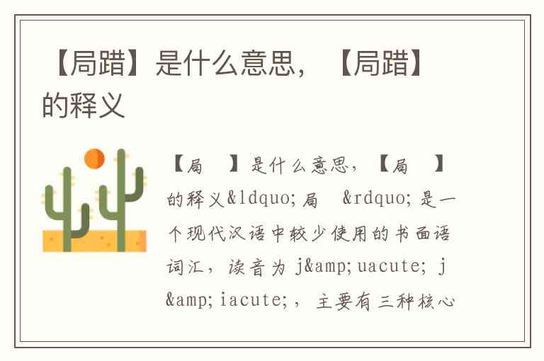 “局踖”是一个现代汉语中较少使用的书面语词汇,读音为 jú jí,主要有三种核心含义:急促、忙乱和惶恐,均带有动态或情绪上的不安感。这个词在古代文献中出现频率较高,尤其在医学典籍和明清散文中常见。