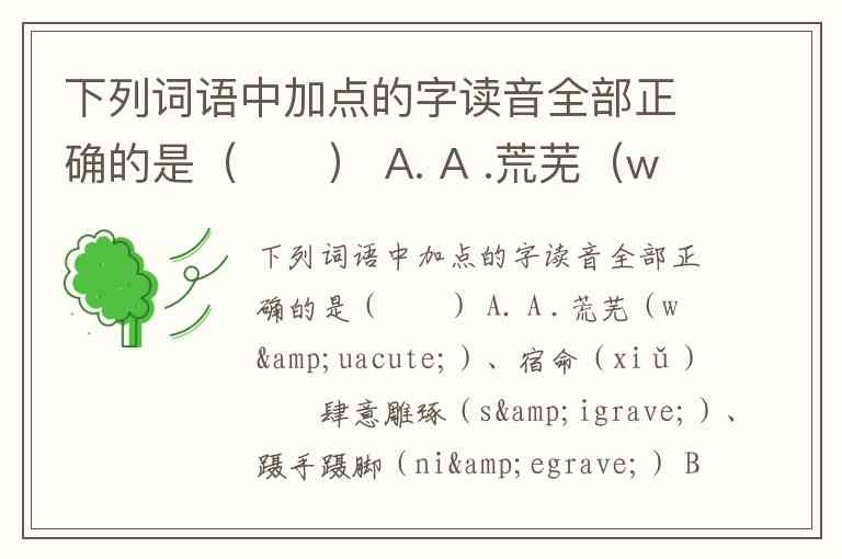 下列词语中加点的字读音全部正确的是( ) A. A .荒芜(wú)、宿命(xiǔ)、肆意雕琢(sì)、蹑手蹑脚(niè) B. B .剥蚀(shí)、熨帖(yùn)、亘古不变(gèn)、鸟儿归巢(cháo) C. C .炫耀(xuàn)、意蕴(yùn)、苔藓遍地(xuǎn)、跌宕而起(dàng) D. D .坍圮(tān)、荒僻(pì)、心神恍惚(huǎng)、猝然去世(cù)