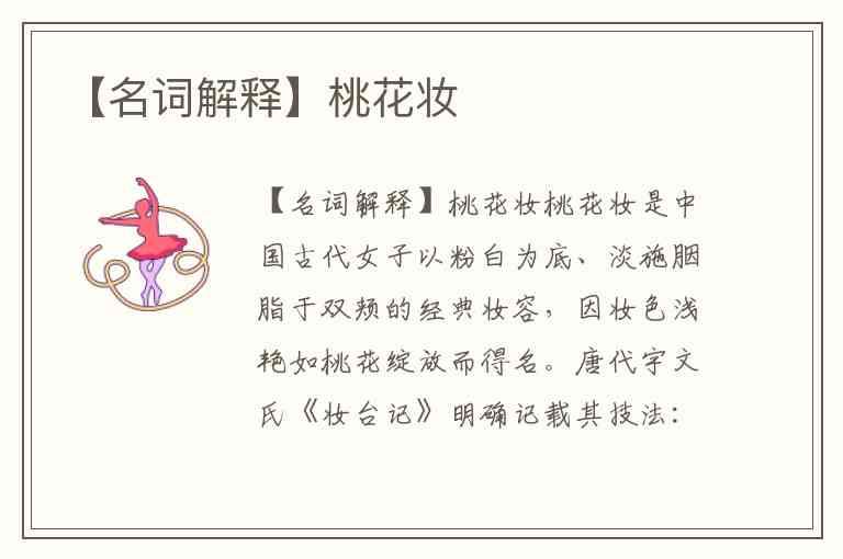 桃花妆是中国古代女子以粉白为底、淡施胭脂于双颊的经典妆容,因妆色浅艳如桃花绽放而得名。唐代宇文氏《妆台记》明确记载其技法:“面既傅粉,复以胭脂调匀掌中,施之两颊……淡者为桃花妆”,与浓艳的“酒晕妆”形成鲜明对比。这种妆容在初唐后期已流行,以绛朱唇、眉间红砂搭配双颊腮红,营造娇俏灵动的气质,完美诠释了“面若桃花”的审美理想。