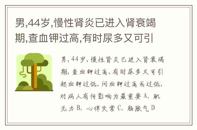 男,44岁,慢性肾炎已进入肾衰竭期,查血钾过高,有时尿多又可引起血钾过低,问血钾过高或过低,对病人有何影响为最重要 A. 肌无力 B. 心律失常 C. 肠胀气 D. 血压低 E. 呼吸缓慢