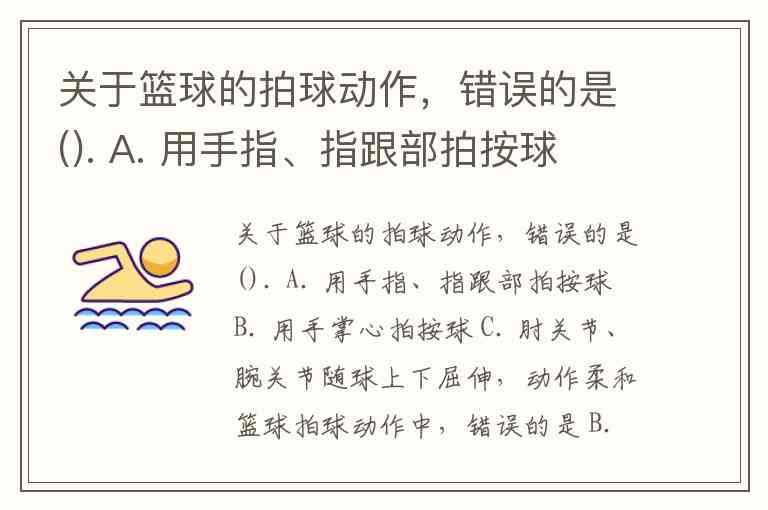 关于篮球的拍球动作,错误的是(). A. 用手指、指跟部拍按球 B. 用手掌心拍按球 C. 肘关节、腕关节随球上下屈伸,动作柔和