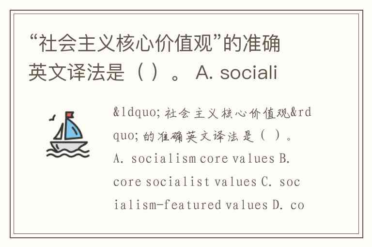 “社会主义核心价值观”的准确英文译法是( )。 A. socialism core values B. core socialist values C. socialism-featured values D. core values with Chinese characteristics