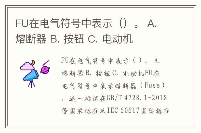 FU在电气符号中表示()。 A. 熔断器 B. 按钮 C. 电动机