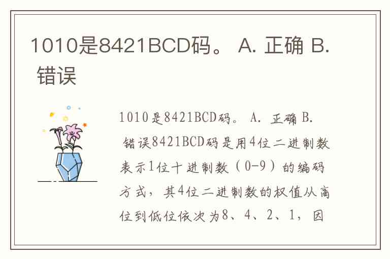 8421BCD码是用4位二进制数表示1位十进制数(0-9)的编码方式,其4位二进制数的权值从高位到低位依次为8、4、2、1,因此有效编码范围是0000(0)至1001(9)。对于二进制数1010,按权值计算其十进制值为 1×8+0×4+1×2+0×1=10,超出了1位十进制数(0-9)的表示范围,不符合8421BCD码的编码规则。