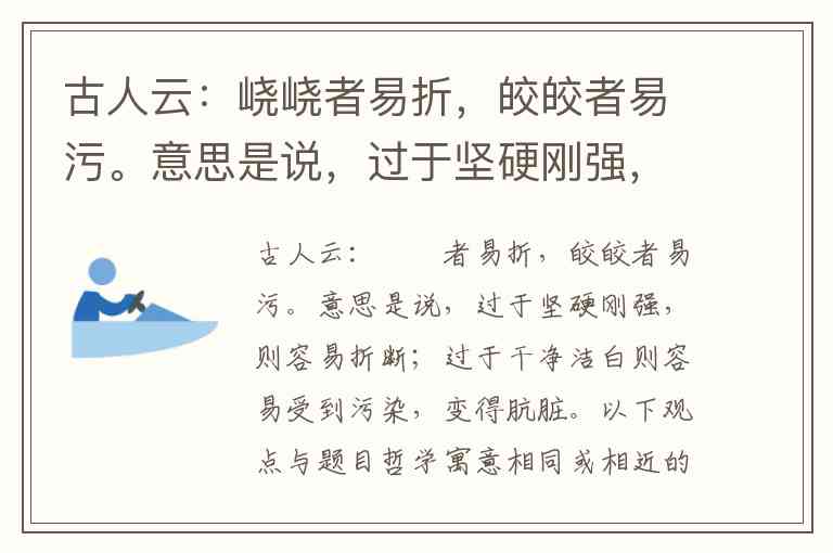 “峣峣者易折,皎皎者易污”蕴含着中国古代朴素的辩证思想,揭示了事物发展超过一定限度会向相反方向转化的规律——过于刚直易遭摧折,过于洁净易被污染,体现了矛盾双方在特定条件下相互依存、相互转化的哲学原理。这一智慧在以下观点中得到呼应: