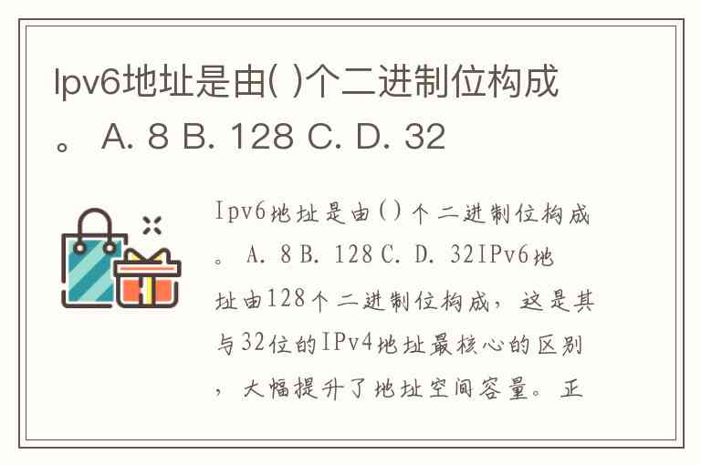 Ipv6地址是由( )个二进制位构成。 A. 8 B. 128 C. D. 32