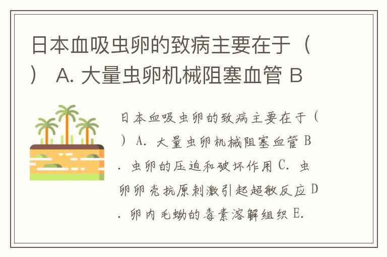 日本血吸虫卵的致病主要在于() A. 大量虫卵机械阻塞血管 B. 虫卵的压迫和破坏作用 C. 虫卵卵壳抗原刺激引起超敏反应 D. 卵内毛蚴的毒素溶解组织 E. 卵内毛蚴分泌物引起超敏反应及肉芽肿形成