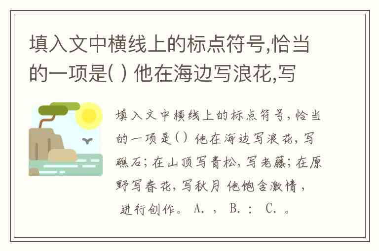 填入文中横线上的标点符号,恰当的一项是( ) 他在海边写浪花,写礁石;在山顶写青松,写老藤;在原野写春花,写秋月 他饱含激情 , 进行创作。 A. , B. : C. 。 D. ;