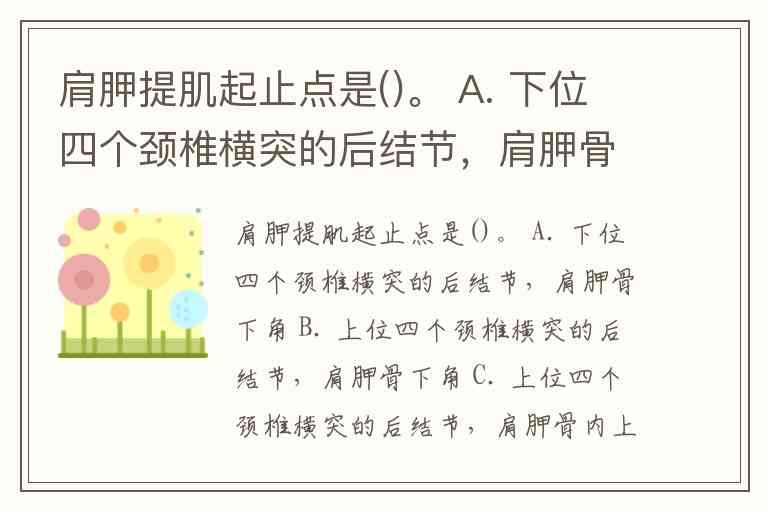 肩胛提肌起止点是()。 A. 下位四个颈椎横突的后结节,肩胛骨下角 B. 上位四个颈椎横突的后结节,肩胛骨下角 C. 上位四个颈椎横突的后结节,肩胛骨内上角 D. 下位四个颈椎横突的后结节,肩胛骨内上角