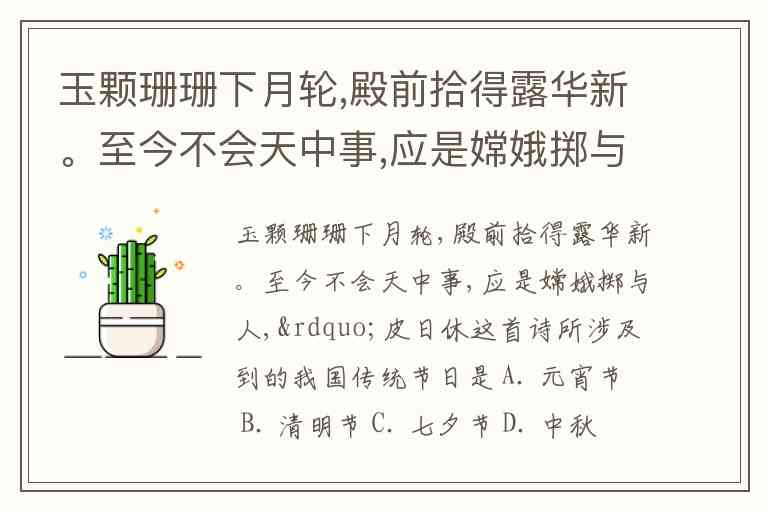 玉颗珊珊下月轮,殿前拾得露华新。至今不会天中事,应是嫦娥掷与人,”皮日休这首诗所涉及到的我国传统节日是 A. 元宵节 B. 清明节 C. 七夕节 D. 中秋节