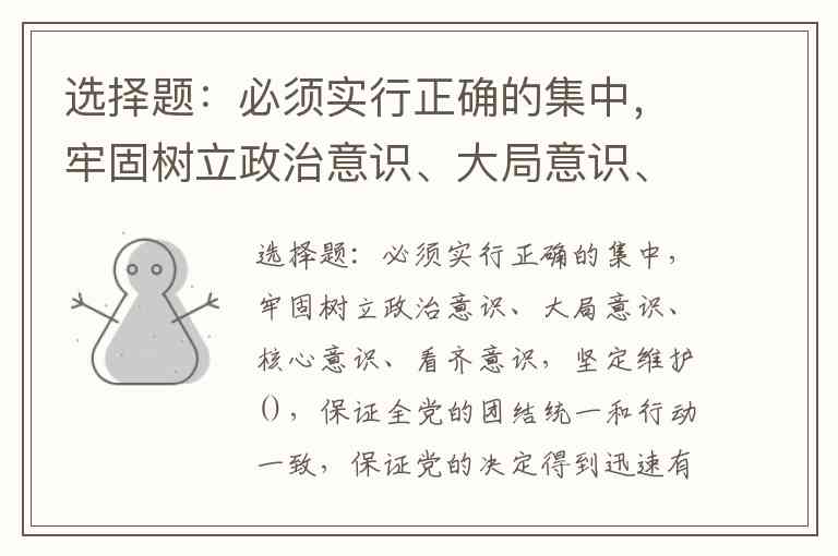 选择题:必须实行正确的集中,牢固树立政治意识、大局意识、核心意识、看齐意识,坚定维护(),保证全党的团结统一和行动一致,保证党的决定得到迅速有效的贯彻执行。