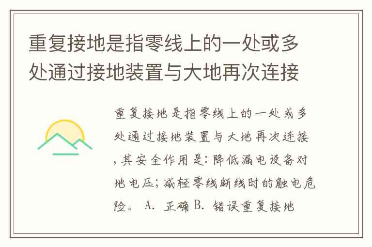 重复接地是指零线上的一处或多处通过接地装置与大地再次连接,其安全作用是:降低漏电设备对地电压;减轻零线断线时的触电危险。 A. 正确 B. 错误