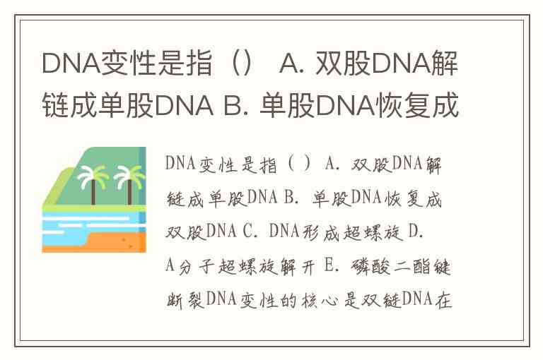DNA变性是指() A. 双股DNA解链成单股DNA B. 单股DNA恢复成双股DNA C. DNA形成超螺旋 D. A分子超螺旋解开 E. 磷酸二酯键断裂