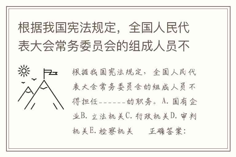选项分析: 选项 是否正确 说明 A. 国有企业 ❌ 否。宪法未禁止全国人大常委会组成人员兼任国有企业职务。 B. 立法机关 ❌ 否。全国人大常委会本身是立法机关组成部分。 C. 行政机关 ✅ 对。不能兼任国务院等行政机关职务。 D. 审判机关 ✅ 对。不能兼任人民法院职务。 E. 检察机关 ✅ 对。不能兼任人民检察院职务。结论: