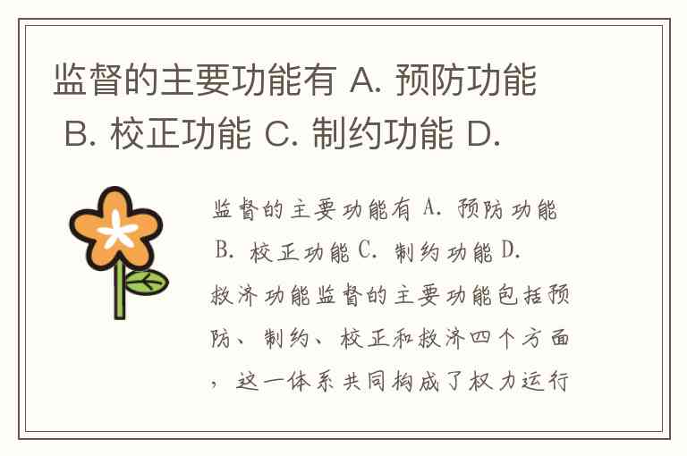 监督的主要功能有 A. 预防功能 B. 校正功能 C. 制约功能 D. 救济功能