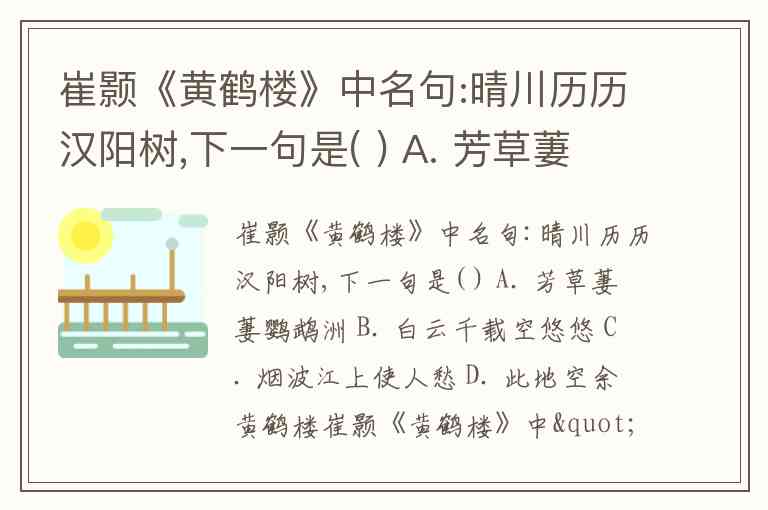 崔颢《黄鹤楼》中名句:晴川历历汉阳树,下一句是( ) A. 芳草萋萋鹦鹉洲 B. 白云千载空悠悠 C. 烟波江上使人愁 D. 此地空余黄鹤楼