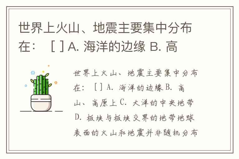 世界上火山、地震主要集中分布在: [ ] A. 海洋的边缘 B. 高山、高原上 C. 大洋的中央地带 D. 板块与板块交界的地带