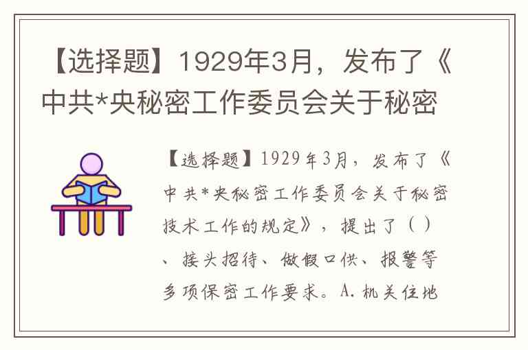 【选择题】1929年3月,发布了《中共*央秘密工作委员会关于秘密技术工作的规定》,提出了()、接头招待、做假口供、报警等多项保密工作要求。