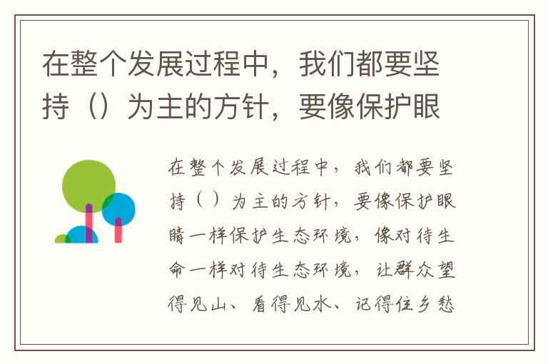 在整个发展过程中,我们都要坚持()为主的方针,要像保护眼睛一样保护生态环境,像对待生命一样对待生态环境,让群众望得见山、看得见水、记得住乡愁,让自然生态美景永驻人间,还自然以宁静、和谐、美丽。 A. 节约优先 B. 保护优先 C. 人为介入 D. 自然恢复
