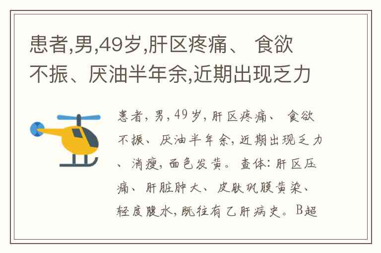 患者,男,49岁,肝区疼痛、 食欲不振、厌油半年余,近期出现乏力、消瘦,面色发黄。查体:肝区压痛、肝脏肿大、皮肤巩膜黄染、轻度腹水,既往有乙肝病史。B超显示肝脏内有多个大小不等的结节。该患者最有可能的诊断为: A. 肝癌 B. 肝炎 C. 肝硬化 D. 肝脓肿 E. 脂肪肝