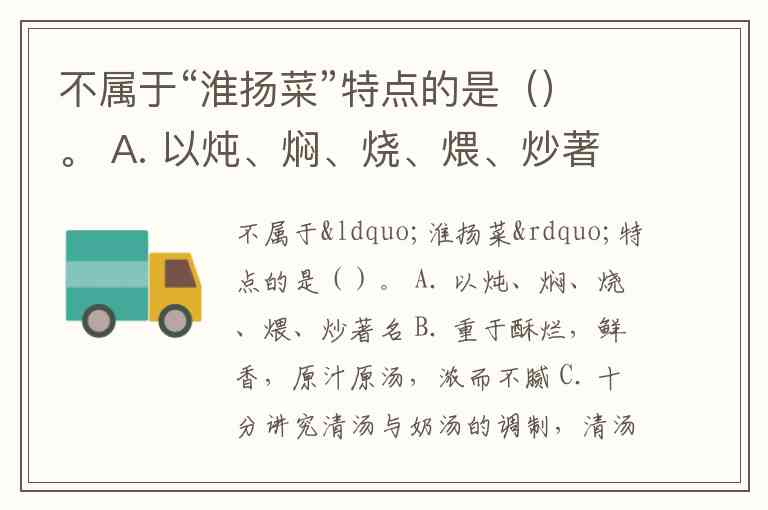 不属于“淮扬菜”特点的是()。 A. 以炖、焖、烧、煨、炒著名 B. 重于酥烂,鲜香,原汁原汤,浓而不腻 C. 十分讲究清汤与奶汤的调制,清汤色清而鲜,奶汤色白而醇 D. 用料考究,注意配色,讲究造形,菜谱四季有别