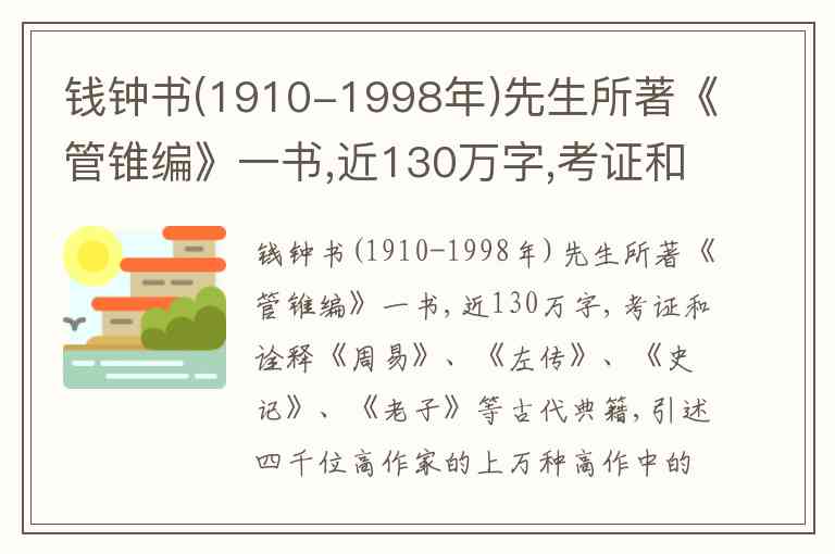 《管锥编》作为钱钟书学术生涯的集大成之作,以其"打通文史哲、贯通中西学"的视野,成为中国现代学术史上的里程碑。这部近130万字的著作考证诠释《周易》《史记》等十部典籍,引述四千位学者的数万条书证,涉猎英、法、德等多语种文献二千余种,构建起跨文化比较研究的恢弘体系。其核心价值体现在三个维度:一是开创了"以管窥天、以锥刺地"的微观比较方法,如分析张融《海赋》"海面涛生而海底波恬"时,同步援引古希腊石雕"表面汹涌而底里晏定"的美学观,揭示人类共通的审美心理;二是建立"心同理同"的阐释学原则,通过斯宾诺莎、维柯的理论与陆象山"东海西海圣人同心同理"的思想对话,论证文化差异背后的人类认知共性;三是形成"破体为用"的学术范式,将一千余则札记串联成网络式结构,使分散的引文在碰撞中迸发新义,正如艾朗诺评价其"像思想的万花筒,每个碎片都折射出多维光谱"。
