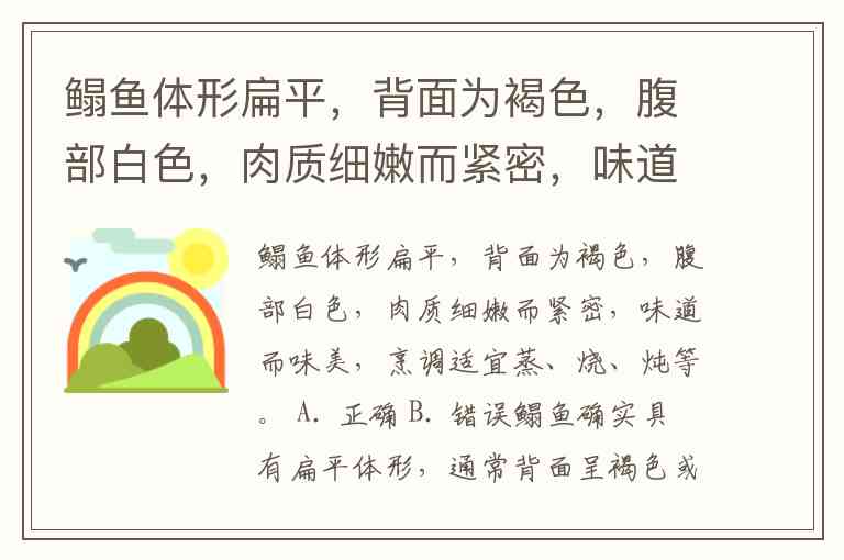 鳎鱼体形扁平,背面为褐色,腹部白色,肉质细嫩而紧密,味道而味美,烹调适宜蒸、烧、炖等。 A. 正确 B. 错误