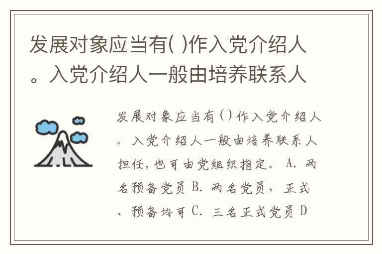 发展对象应当有( )作入党介绍人。入党介绍人一般由培养联系人担任,也可由党组织指定。 A. 两名预备党员 B. 两名党员,正式、预备均可 C. 三名正式党员 D. 两名正式党员