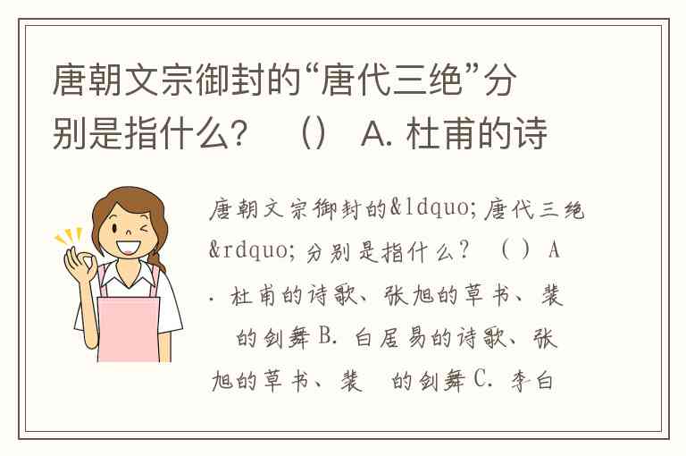 唐朝文宗御封的“唐代三绝”分别是指什么? () A. 杜甫的诗歌、张旭的草书、裴旻的剑舞 B. 白居易的诗歌、张旭的草书、裴旻的剑舞 C. 李白的诗歌、张旭的草书、裴旻的剑舞