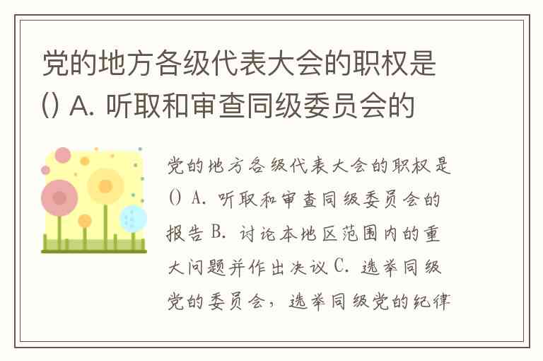 党的地方各级代表大会的职权是() A. 听取和审查同级委员会的报告 B. 讨论本地区范围内的重大问题并作出决议 C. 选举同级党的委员会,选举同级党的纪律检查委员会 D. 修改党的章程