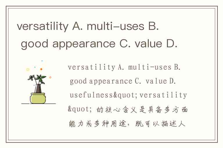 "versatility" 的核心含义是具备多方面能力或多种用途,既可以描述人(多才多艺),也可以描述事物(多功能性)。从提供的选项来看,A. multi-uses(多种用途) 最准确对应其“多用途”这一核心义项。